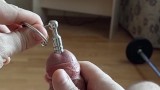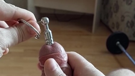 Cumshot through penis urethral plug with glans ring (slow motion cumshot)