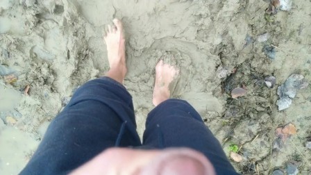 Stepping in mud barefoot - dirty feet and jerk off and stepping on own cum at the end