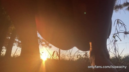 girl peeing with the sunset in the field