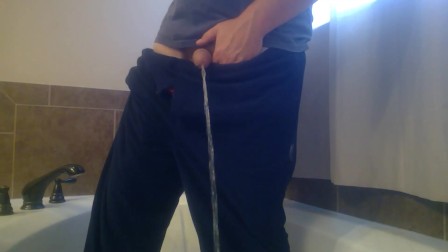 Fast pissing in the tub trying to stay clean during work