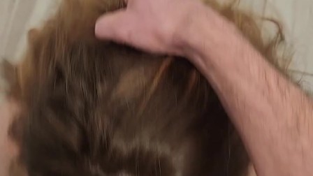 Curvy redhead gets on her knees and swallows for the first time