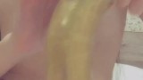 Teen whore with horny nipples sucks banana and condom