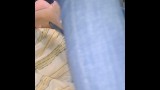Sillicone doll Fortuna in skinny tight jeans on a special stand with spread leg.Cumshot and creampie