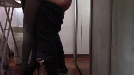 The milf with beautiful legs and pantyhose irons and gets touched and fucked