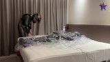Rubber pup drone being milked inside vacuum/rebreathing bag