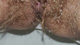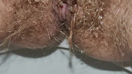 Hairy milf takes out a pink menstrual cup and pees on last day of period