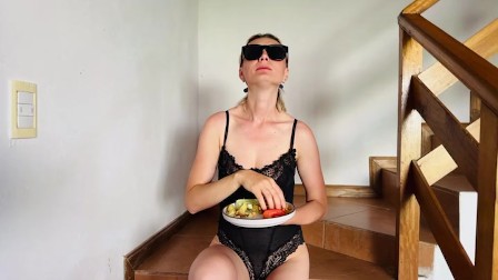 Yes, I'm a young MILF. I eat food seductively and show my breasts