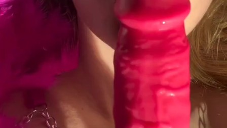 Naughty Blonde Sucks Pink Dildo in Hot Look