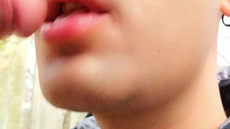Licking last drops of cum from cock after getting facial outdoor