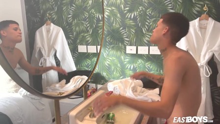 Cute teen latino boy doing striptease in shower