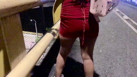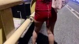 desperate urinates while walking down the street in her little red dress